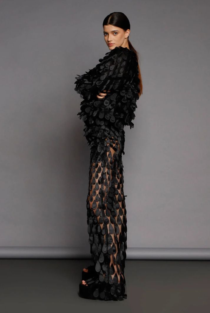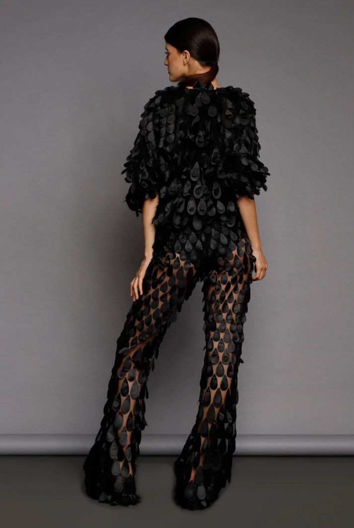 This 3D appliqué bomber jacket redefines casual outerwear with couture-inspired detail. Designed with a puckered neckline and loose sleeves finished with elastic, it delivers a relaxed silhouette elevated by intricate 3D textured applications that transform it into a true statement piece.