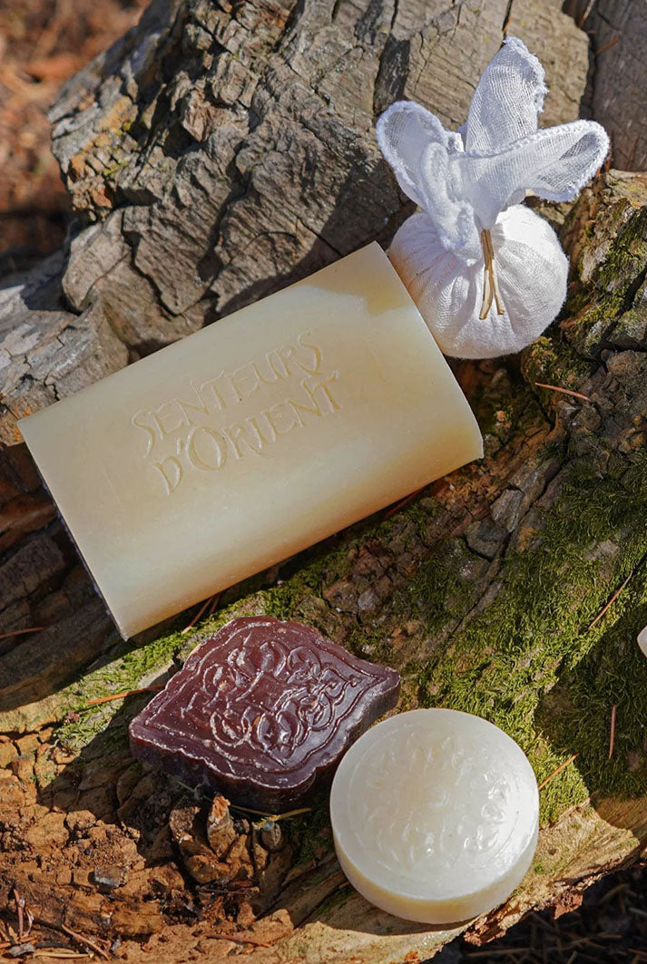 Inside, you will find a curated selection of handmade aromatherapy soaps and a scented bath salt pouch, all crafted to create a soothing, cocooning experience. Each pure vegetal soap is made with shea butter, glycerin, vegetal oils, and essential oils, then handcrafted by local artisans and air dried for ten days. The bath salt pouch is delicately infused with essential oils and prepared by hand for a deeply calming soak.