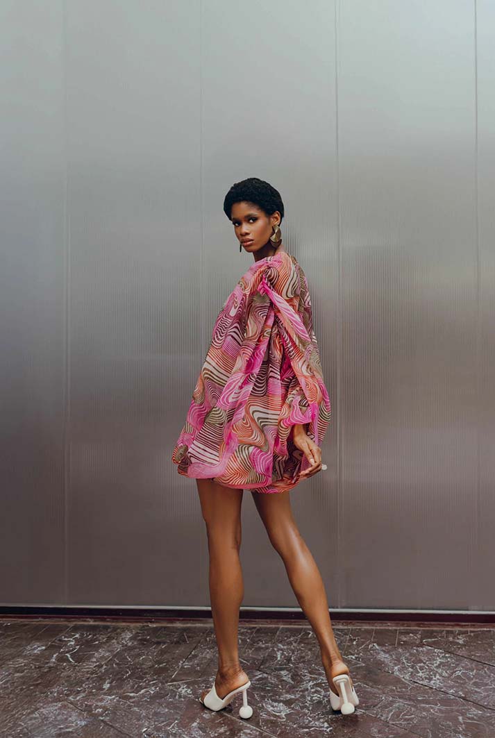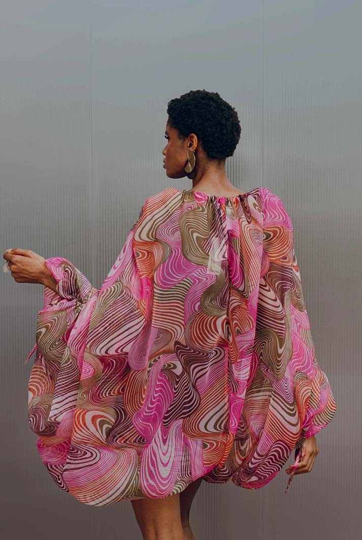 The BANDA Bubble Mini Dress in Corda Print blends playful volume with artful design. This oversized romper silhouette feels sculptural yet light, defined by exaggerated bubble sleeves with gathered detailing and elasticated hems that create a soft, ballooned shape.