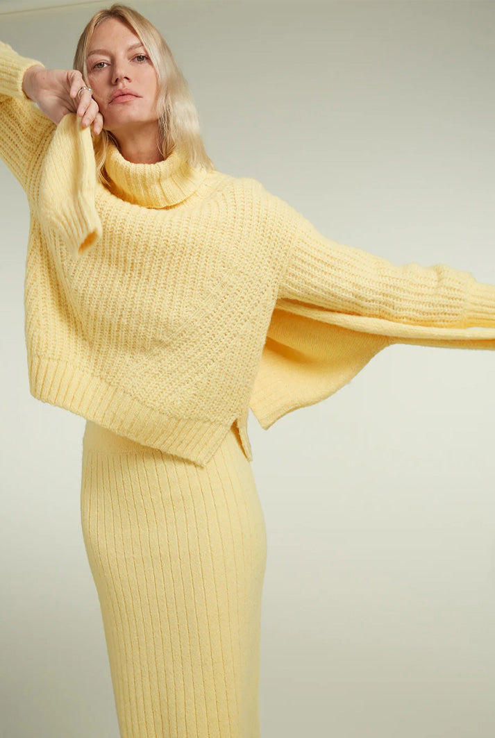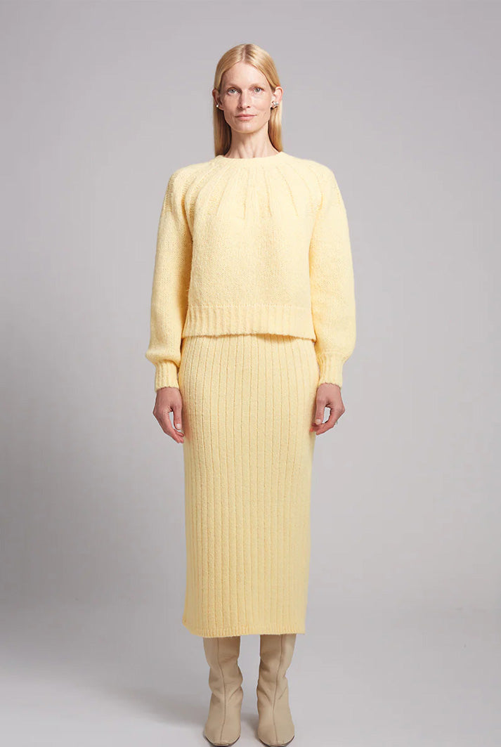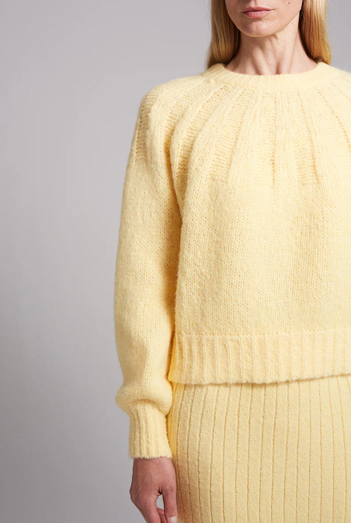 Mila is a relaxed fashion-staple sweater to pop-on-and-go with a feminine blouson-sleeve, a circular ribbed yoke and a slightly-cropped body-proportion, you can pair her back to a high-waisted pants perfectly, making you feel both refined, yet relaxed.