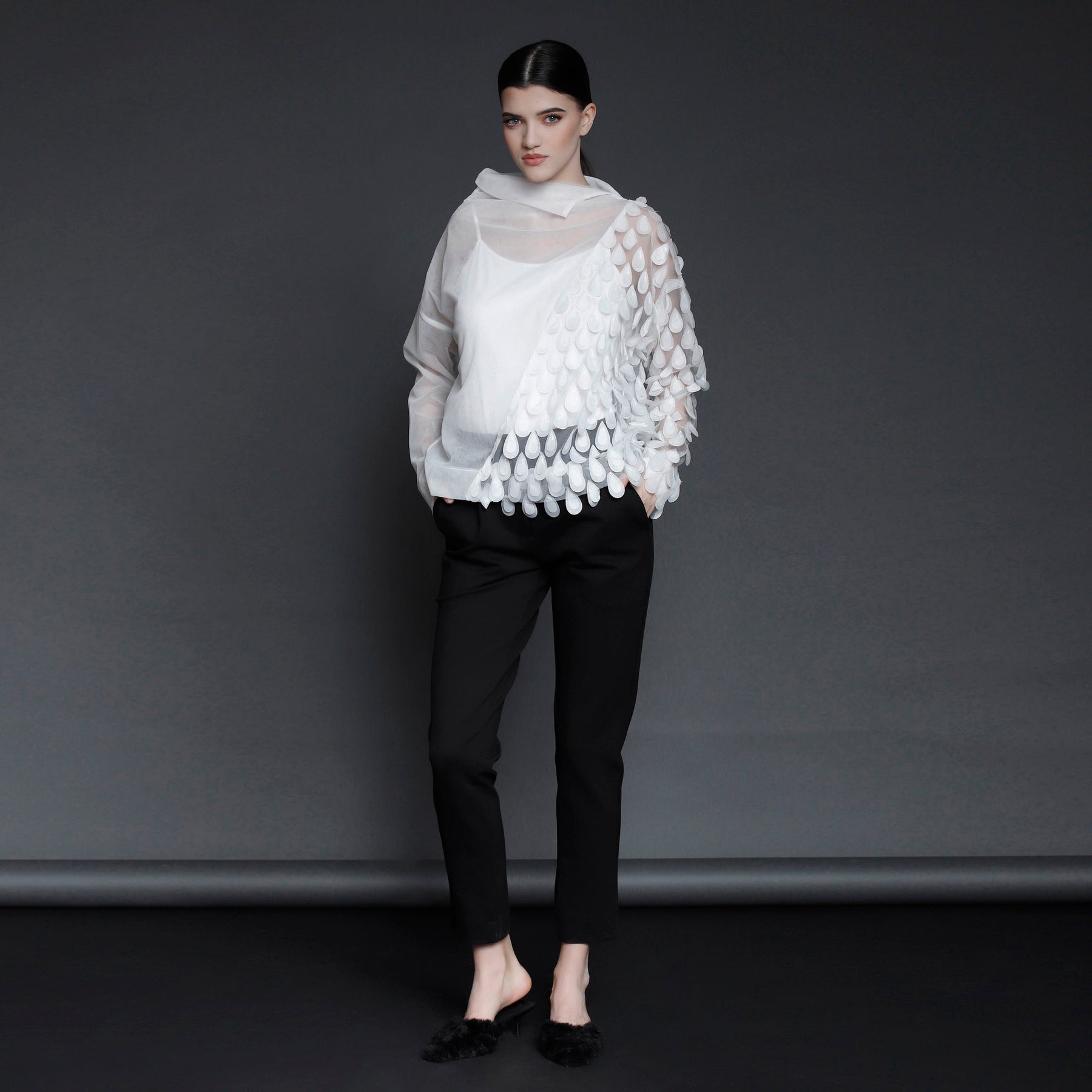 woman wearing white tulle blouse with 3D appliques and asymmetrical collar