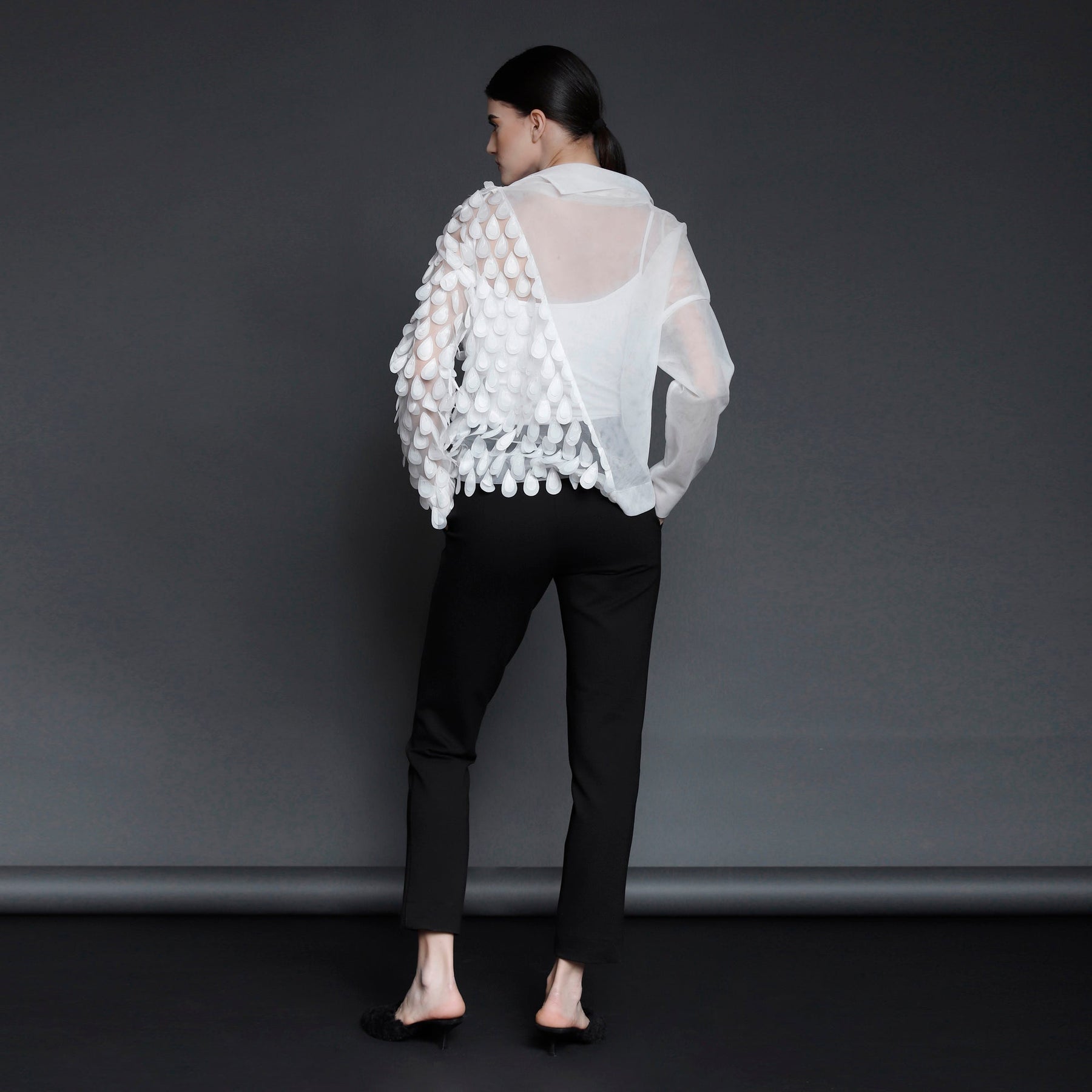 Ethereal and artistic, this White Tulle Blouse with 3D Appliqués captures modern elegance through texture and form. Designed with a collage of simple tulle and sculptural 3D appliqué tulle, it creates a striking interplay of light and depth that feels both delicate and bold.