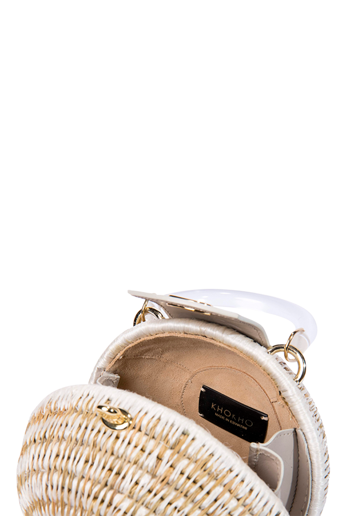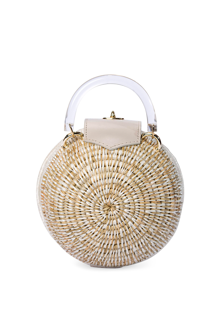 The Woven Demi Ball Bag features a fully round shape composed of two woven halves, assembled together with leather gussets and finished with a turn-lock closure and acrylic handles.