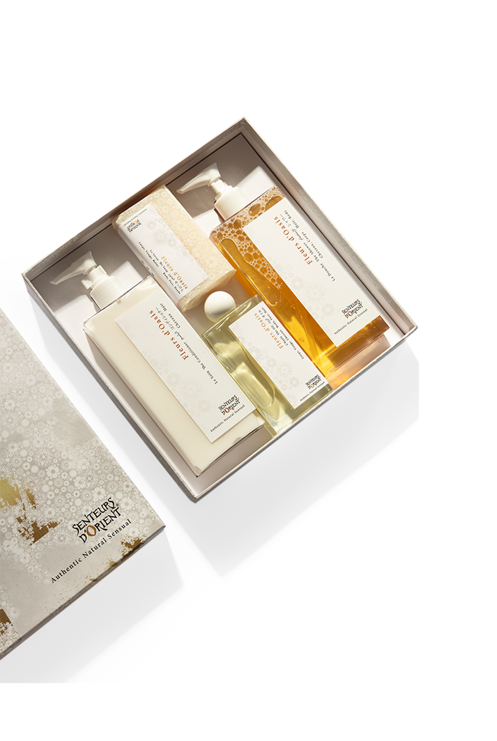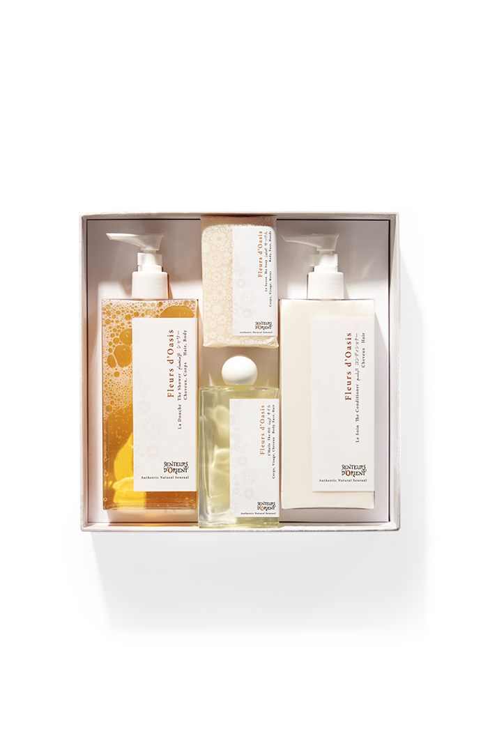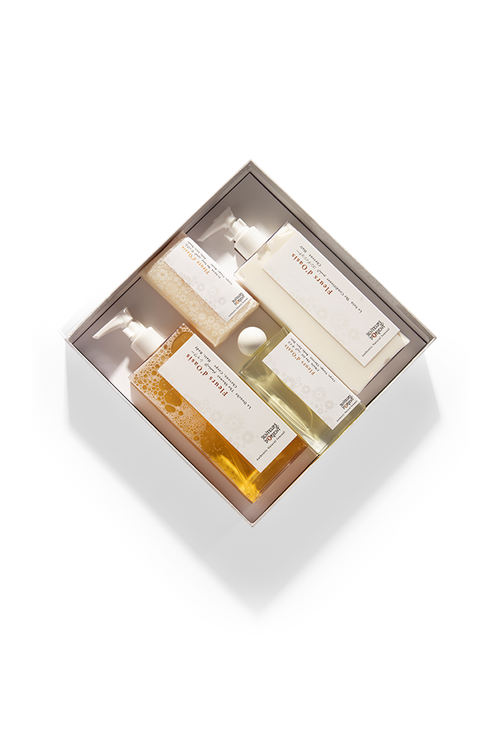 Gift a sensory escape with Fleurs d'Oasis Hair & Body holiday set. A generous set of our sunny and warming care staples featuring an exclusive Fleurs d'Oasis bar soap, only available in this gift set.