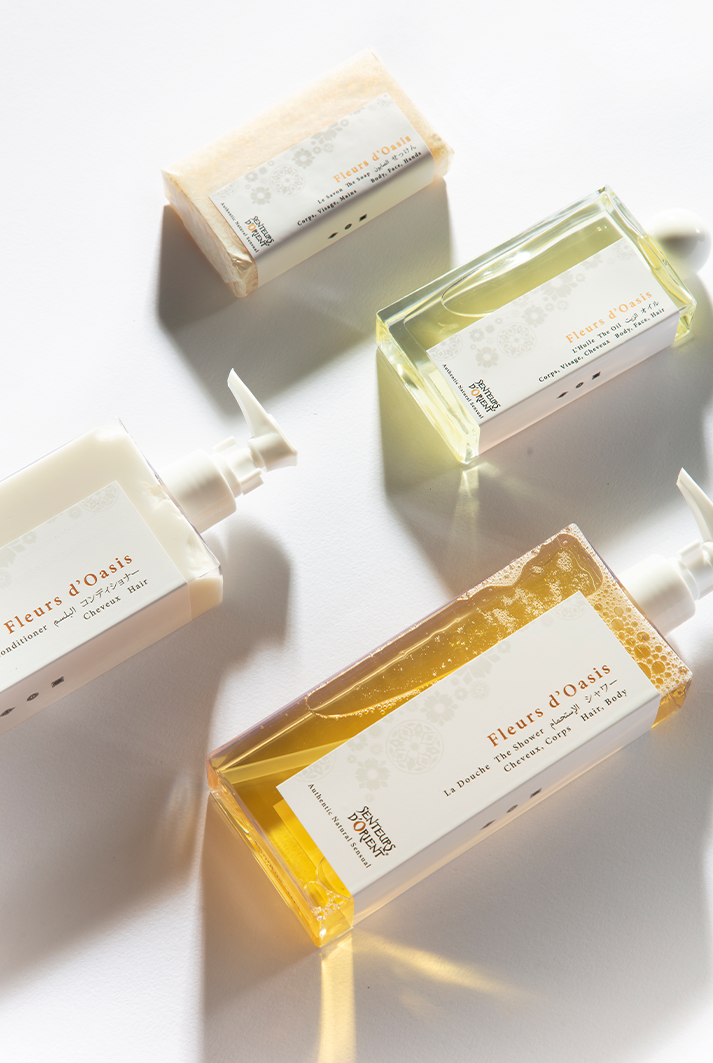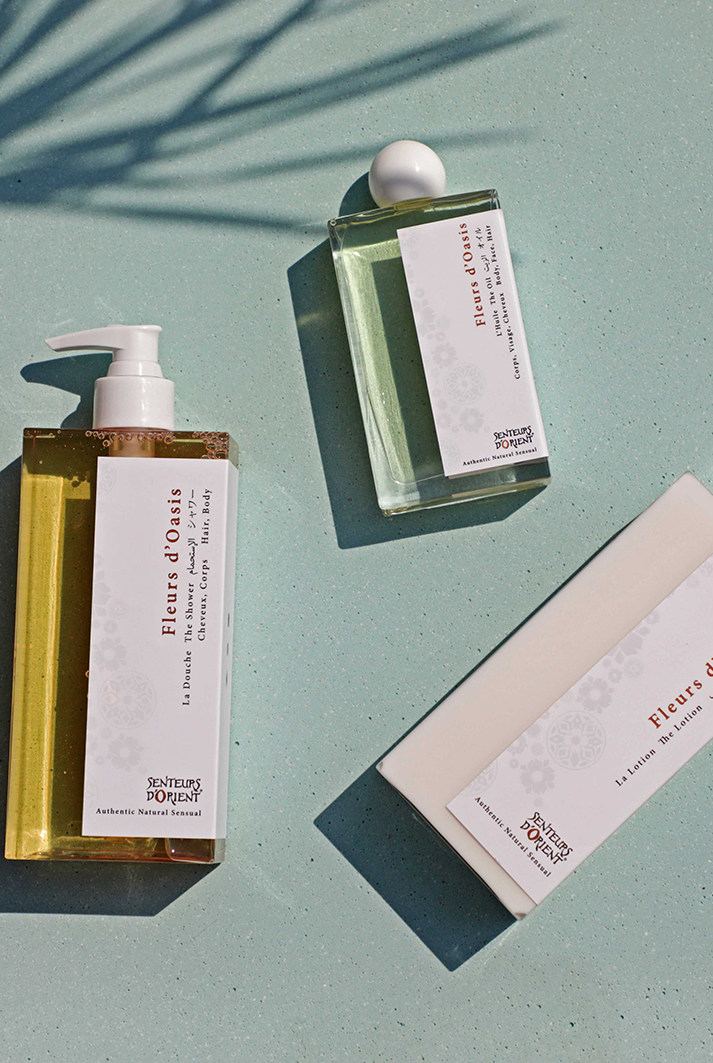 Fleurs d'Oasis scent is a symphonic fusion of fresh Neroli, Red Thyme and Cypress emerging though sensual depths of velvety Jasmine and sun-kissed Musk.
