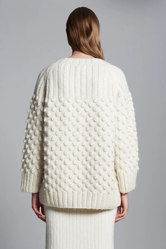 Lian cardi is a relaxed, yet novel cardi to wrap up and cocoon in. Hand knit with the softest air-spun alpaca-blend yarn in a sumptuous, chunky popcorn stitch, this cardi is very light and lofty to the touch in this must-have, classic ivory hue.