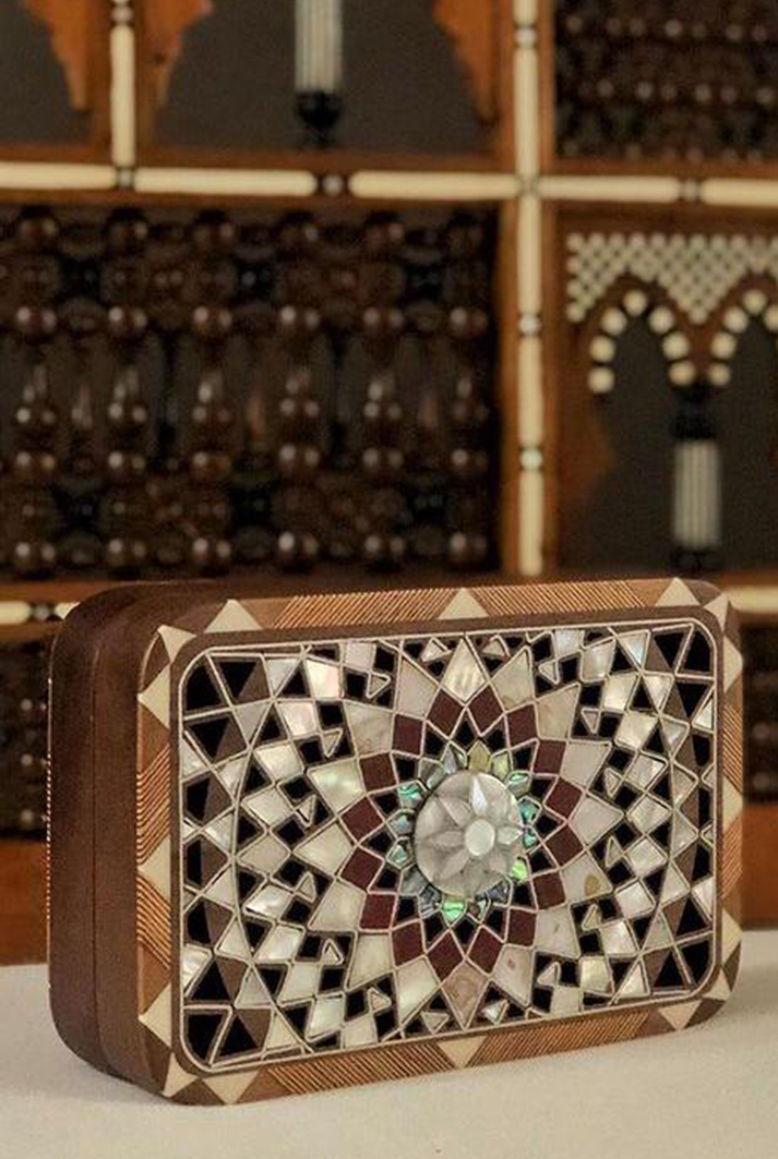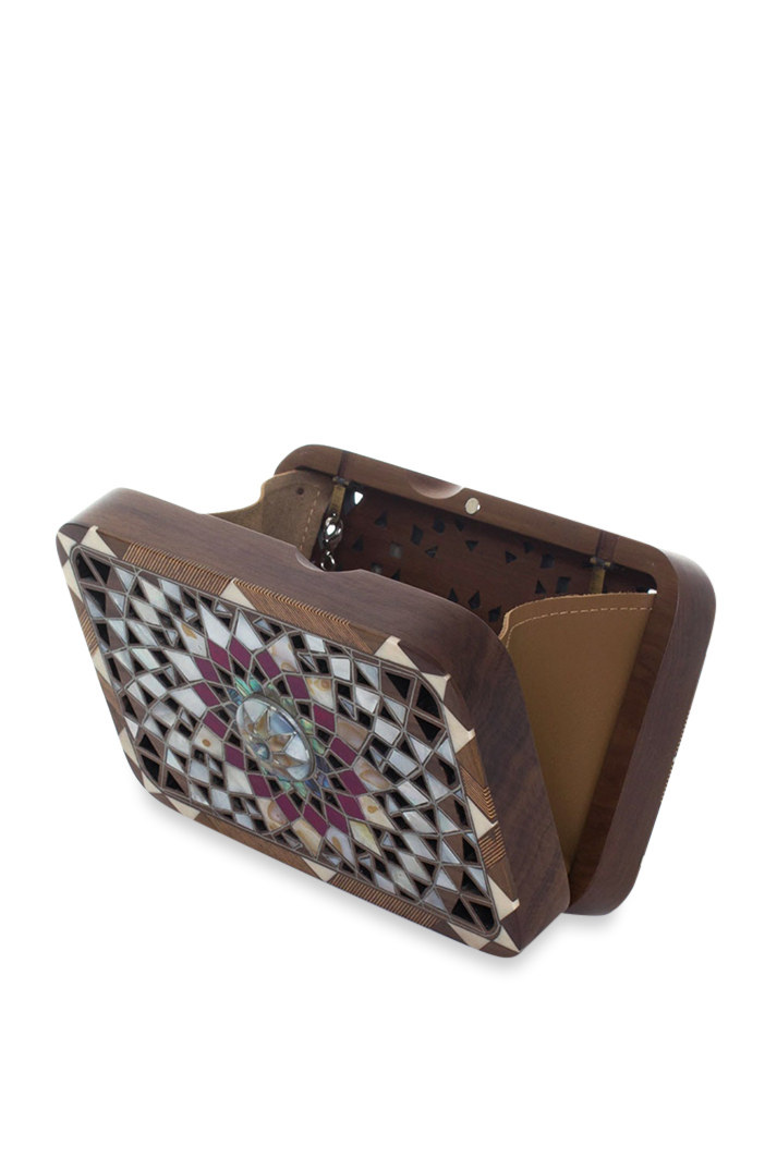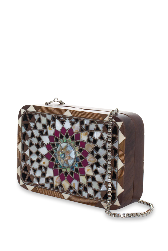 East meet East in this exquisitely crafted statement clutch that can work any outfit, from dressy jeans to flirty cocktail dresses and beyond. The ancient Indian art of Mandala meets the traditional Levantine technique of mother of pearl inlay on nude walnut wood, with the colors warming up from pearlescent to a red center. This compact Mandala clutch has a brass shoulder chain for a hassle-free day or night out!
