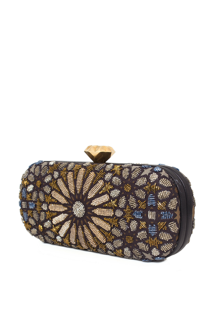 Regular price $500.00Elevate any chic day or evening look with this vibrant, standout box that celebrates the Islamic art of zelij, an exquisite form of mosaic tile work popular across Morocco. An intricate pattern is meticulously hand beaded in golden hues onto this oversized box, perfect for the ladies that like their evening bags big and statements even bigger.