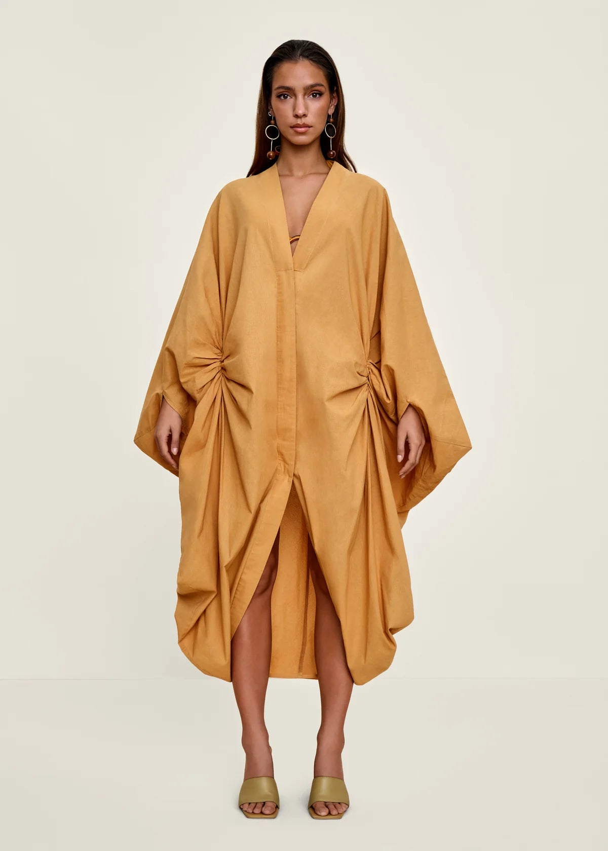 The Labu Mustard Cotton Robe redefines relaxed elegance. Crafted from 100% cotton, this sculptural robe features a voluminous bubble silhouette with gathered ruching through the center front for an artistic touch.