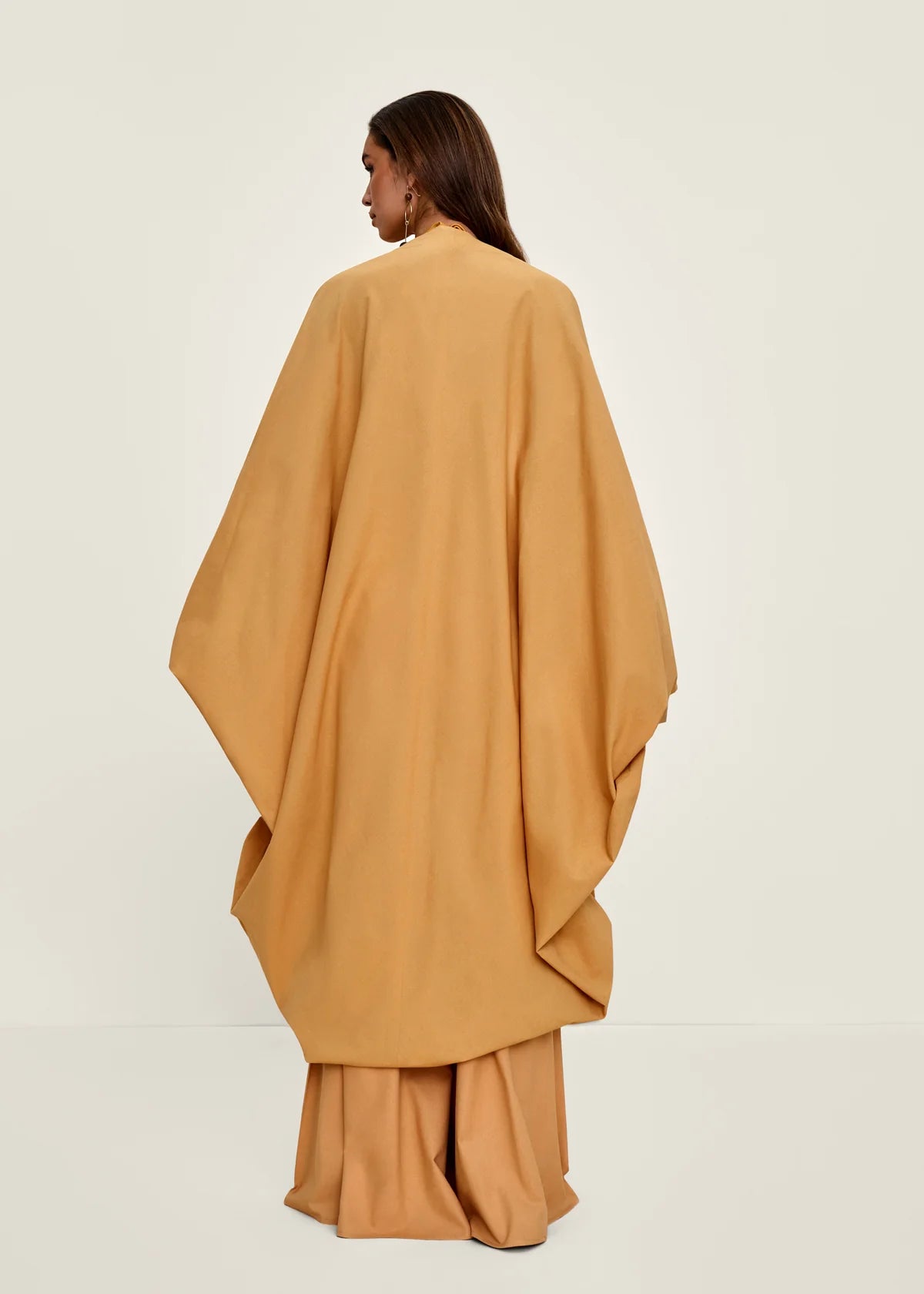 Its concealed placket button closure maintains a clean, minimalist look, while keyhole openings allow for effortless movement and functionality. The rich mustard hue enhances its dramatic volume, making it a striking piece for both lounging and statement dressing.