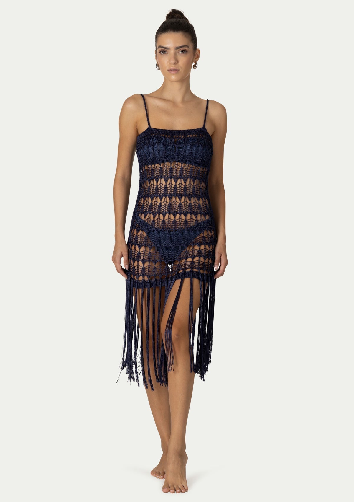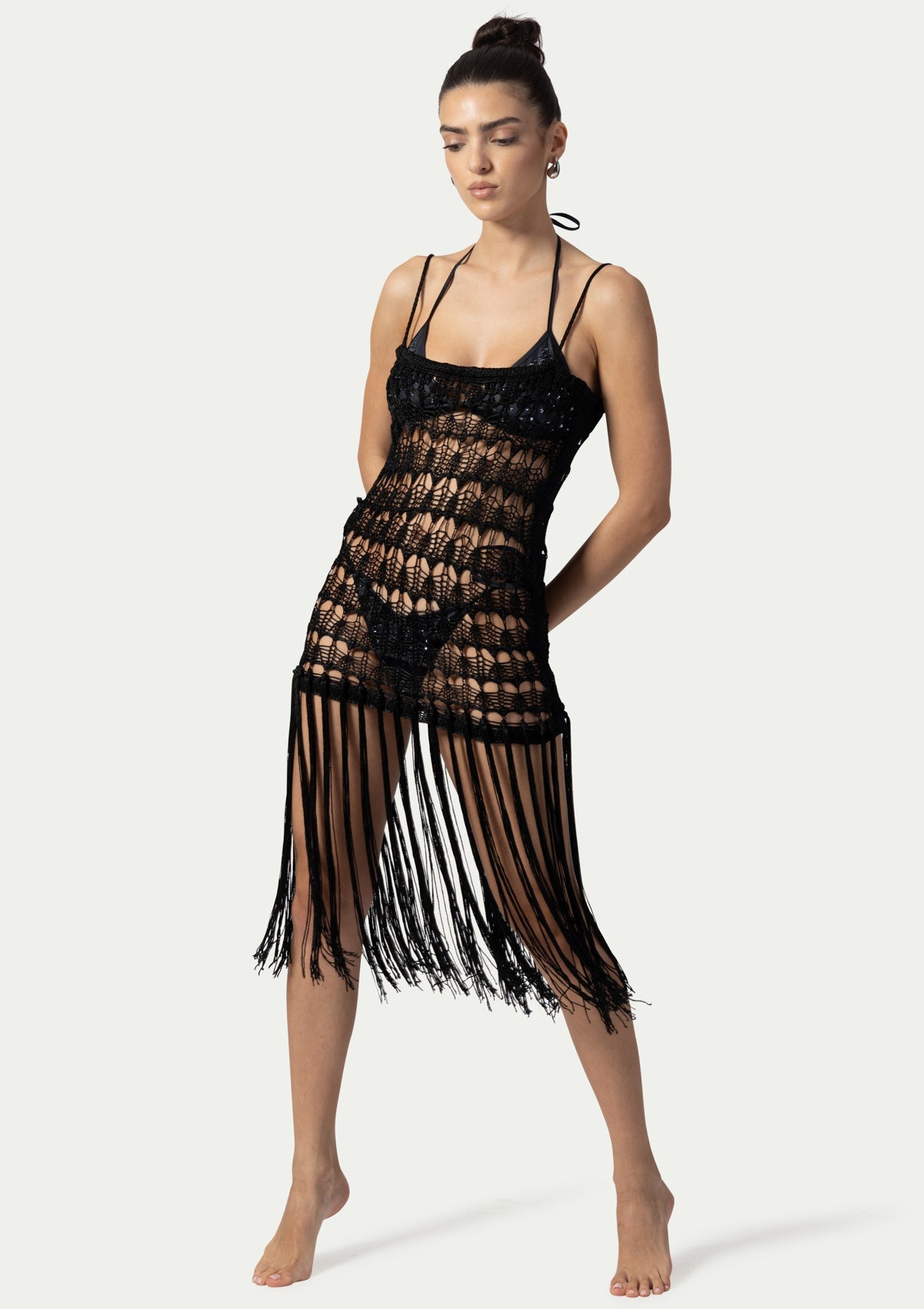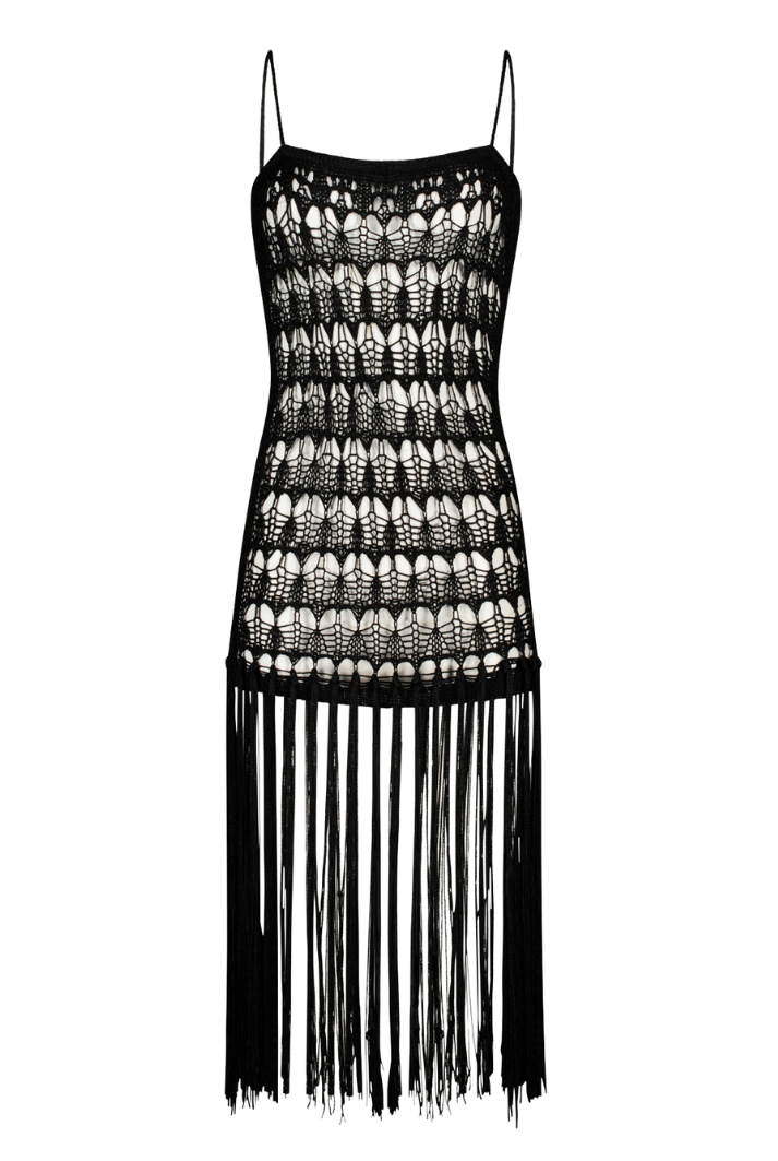 Regular price $360.00DAHLIA DRESS by PARAMIDONNA is a knitted midi dress in 100% silk thread, available in sizes XS/S and M/L. With an interesting silhouette, this dress has a spectacular fringe all over its bottom that gives a dynamic and bohemian look. Its open knit pattern showcases a variety of beautifully placed holes that allow the swimsuit to peek through, creating the perfect beach look. Whether you're strolling by the beach or enjoying a sunset cocktail, DAHLIA DRESS combines elegance with a casual, summer vibe.