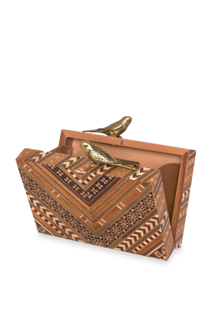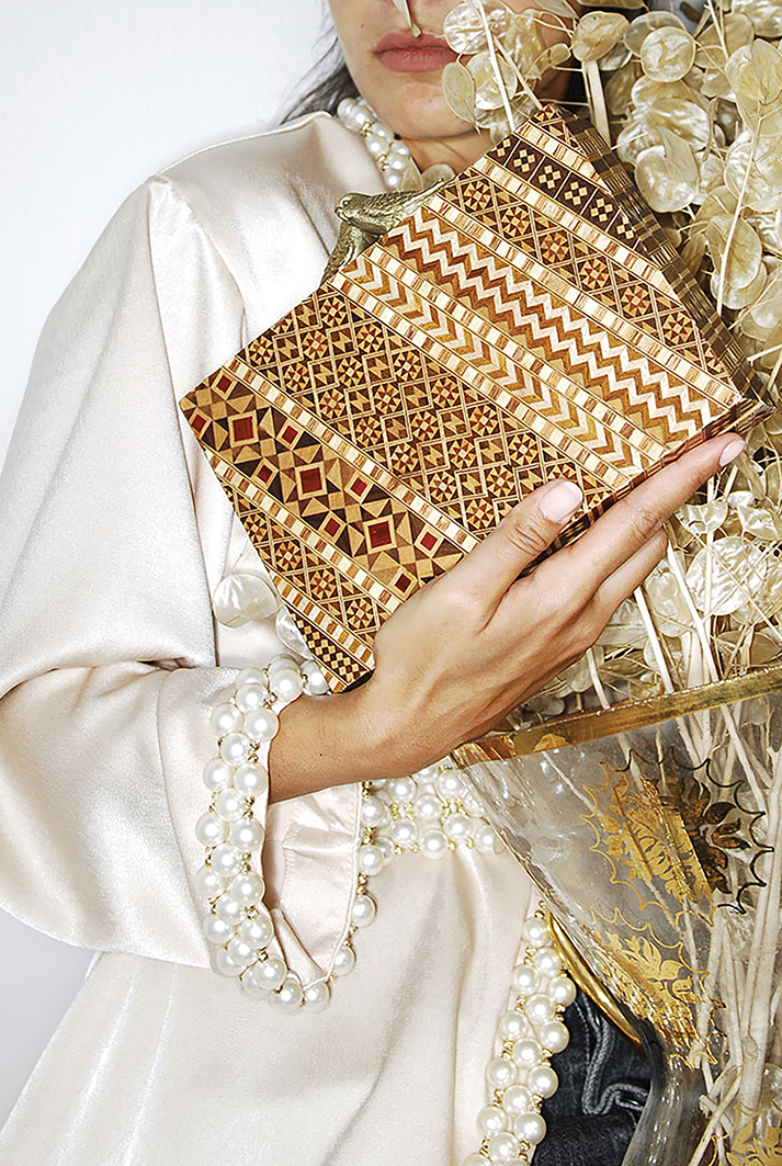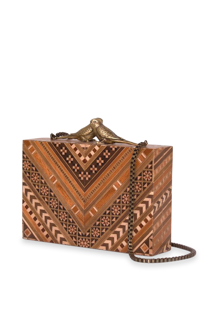 A twist on our classic Dama bag, this handmade statement clutch is a true manifestation of exquisite traditional craftsmanship. It showcases a centuries-old technique called marquetry where pieces of different types of wood are applied to a wood veneer to form mosaics and geometric shapes. With our signature brass embracing budgies clasp. The clutch has an optional shoulder chain.