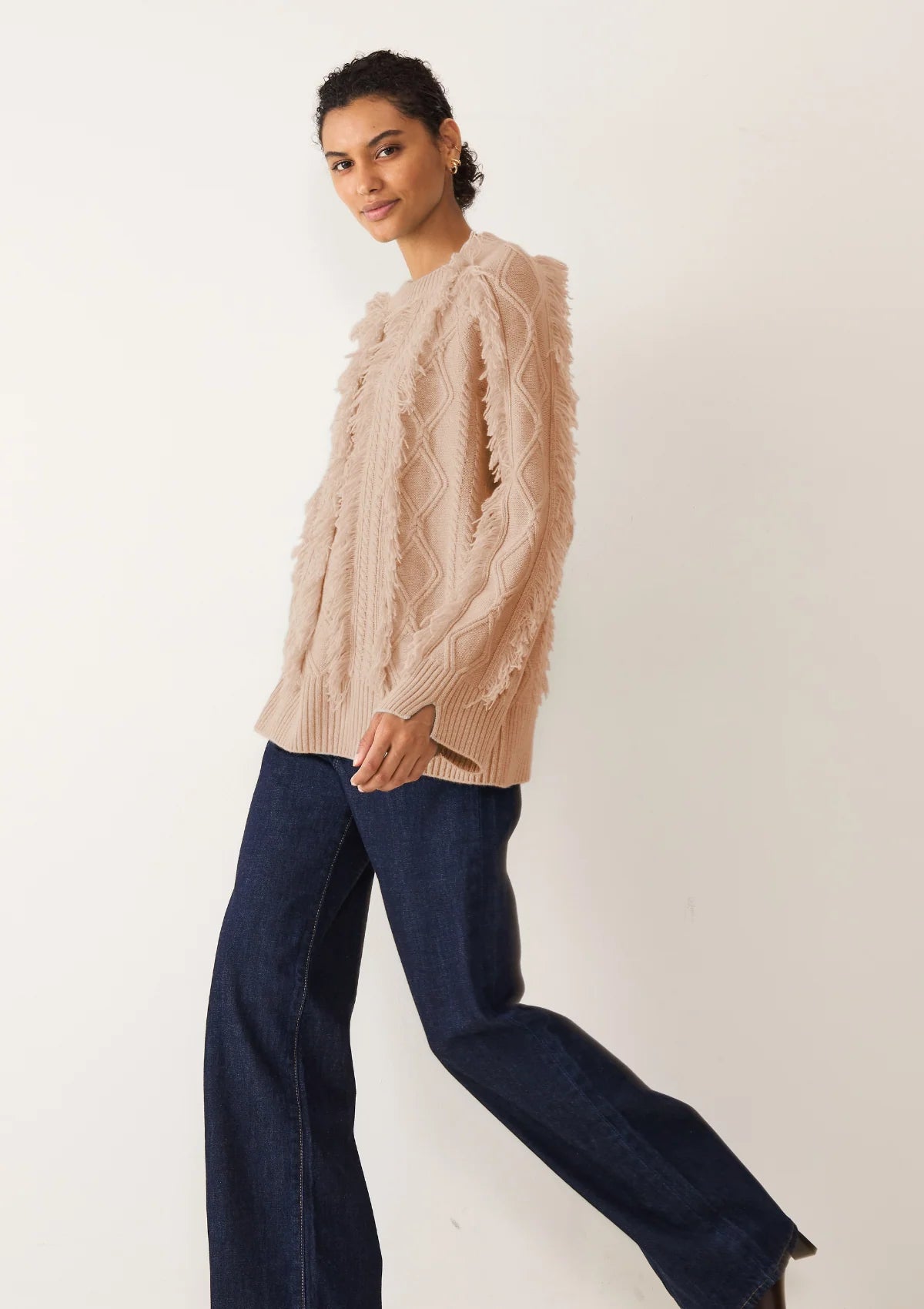 Elevate your knitwear collection with this fringe cabled cashmere sweater in toffee, a playful yet refined piece that merges timeless craftsmanship with modern detail. Crafted from naturally insulating, sustainably sourced Mongolian cashmere, it delivers unbeatable softness and warmth while ensuring lasting quality. The classic crew neck silhouette is reimagined with vintage-inspired fringes, adding movement and personality to the traditional cable knit design. A versatile shade of toffee brown makes this sweater an effortless match with tailored trousers, denim or layered skirts, transitioning seamlessly from casual daywear to elevated evenings. Designed for longevity and mindful consumption, this luxury women’s cashmere sweater is a piece to be worn, cherished and treasured for seasons to come.