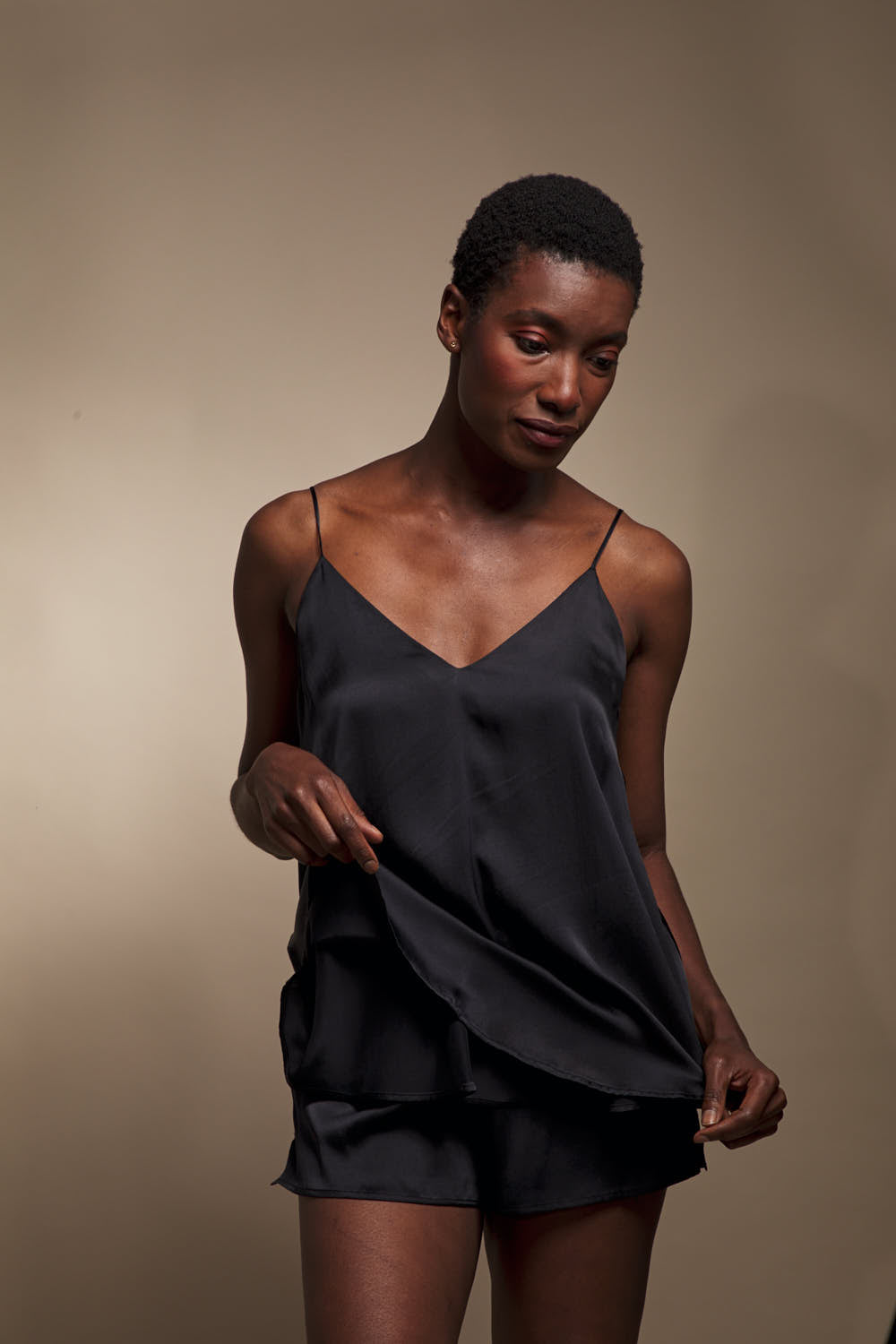 Regular price $265.00 Sale price $240.00 Save $25.00Let the body indulge in the exquisite aesthetic and luxuriously smoothness of organic silk against the skin. Crafted from cruelty-free, 100% premium Organic Peace Silk, this supremely soft, classic black camisole PJ set is endlessly appealing. Not only is it a pleasure to sleep in, it doubles up beautifully as luxurious separates during the day.