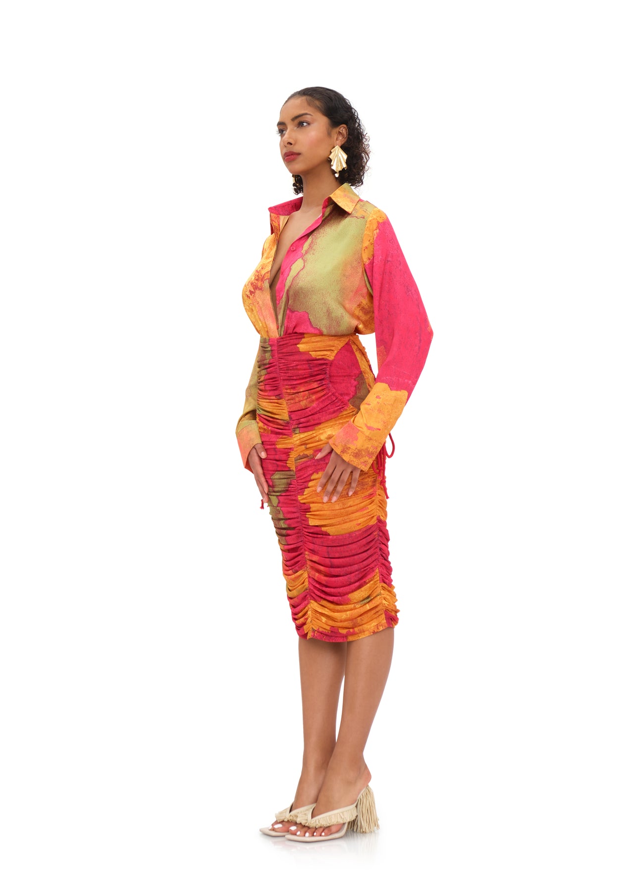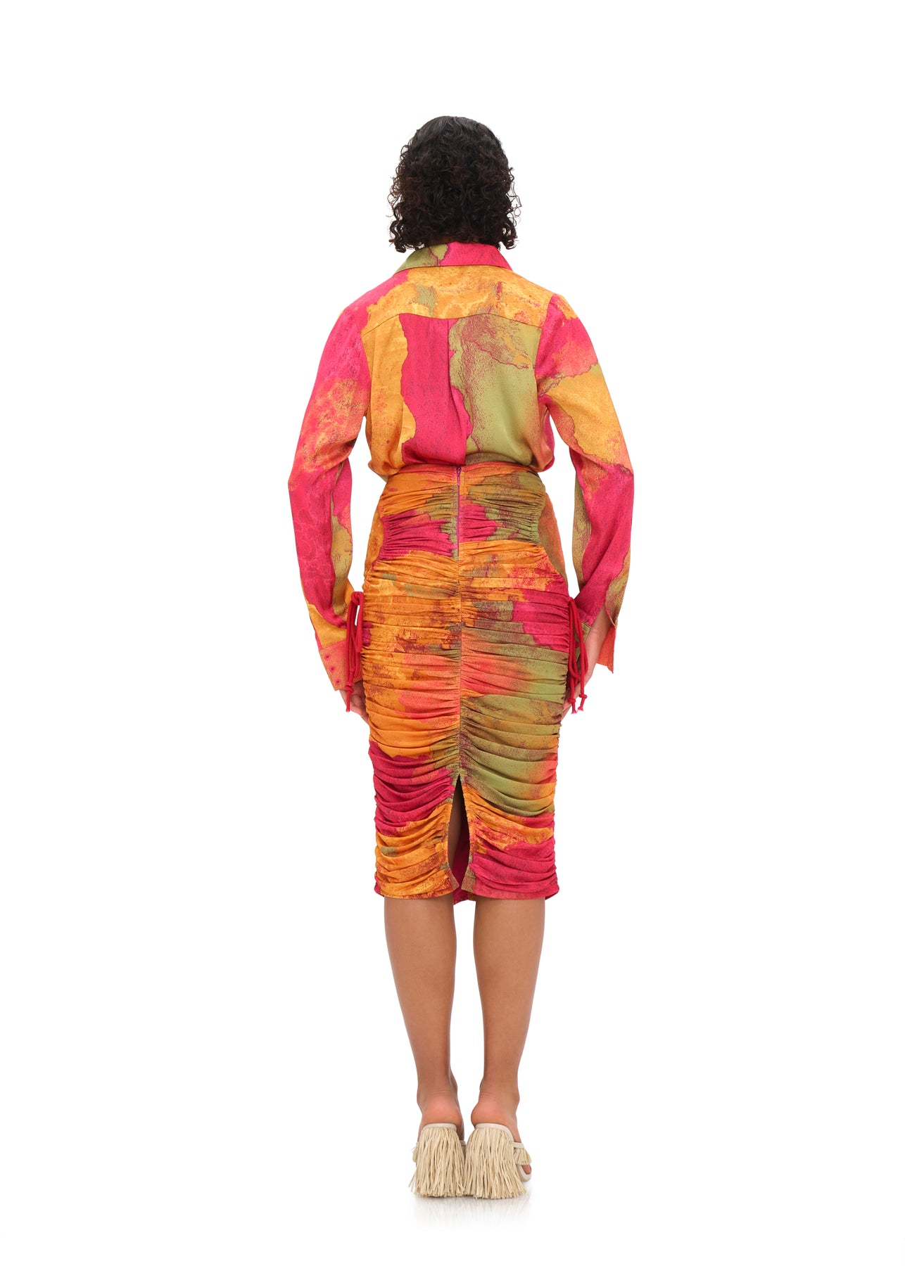 Inspired by the many layers of love, the TAKA MESH MIDI SKIRT in the ERO-II print beautifully hugs and accentuates the feminine figure. Can be paired with the PARA MESH LEOTARD OR THE ARA SHIRT for an all print look.