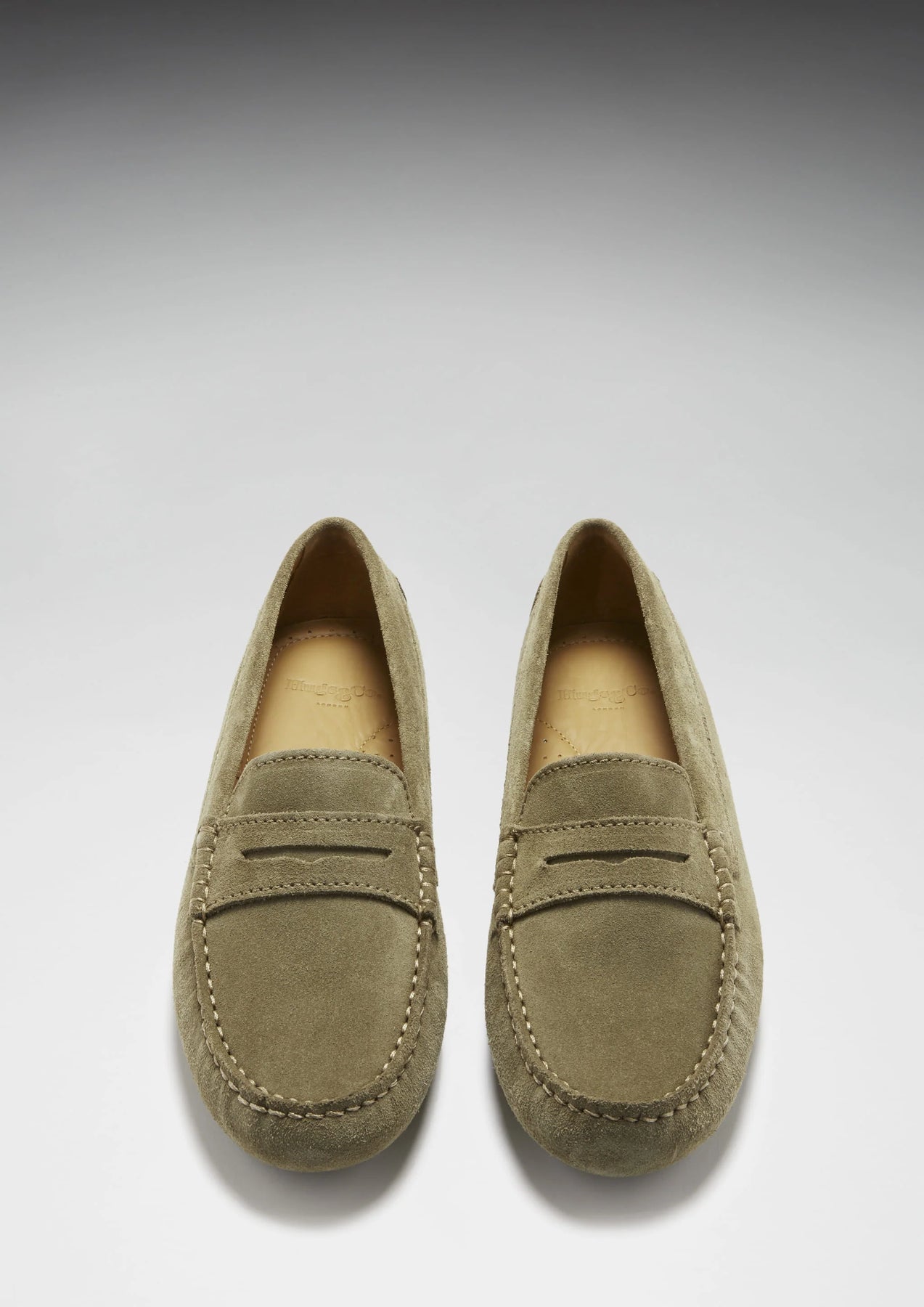 Hugs & Co. taupe penny loafer driving shoes for women. Moccasin style driving loafers in taupe suede upper and lined with a soft leather for extra comfort. Made in Portugal