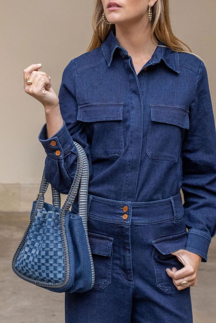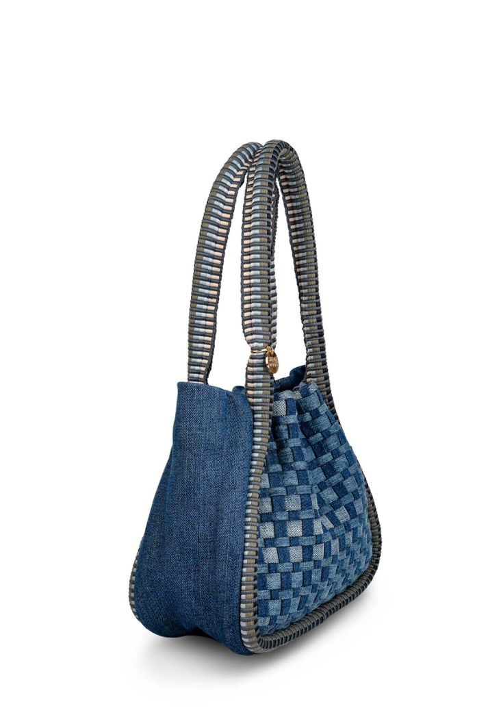 Its unique handwoven denim panels on each side gather along the top for a soft, pleated shape, while piped jacquard handles wrap elegantly around the body, adding both structure and texture. Inside, multiple compartments keep your essentials organized — from your phone to your iPad, while a press-stud top closure secures your belongings.