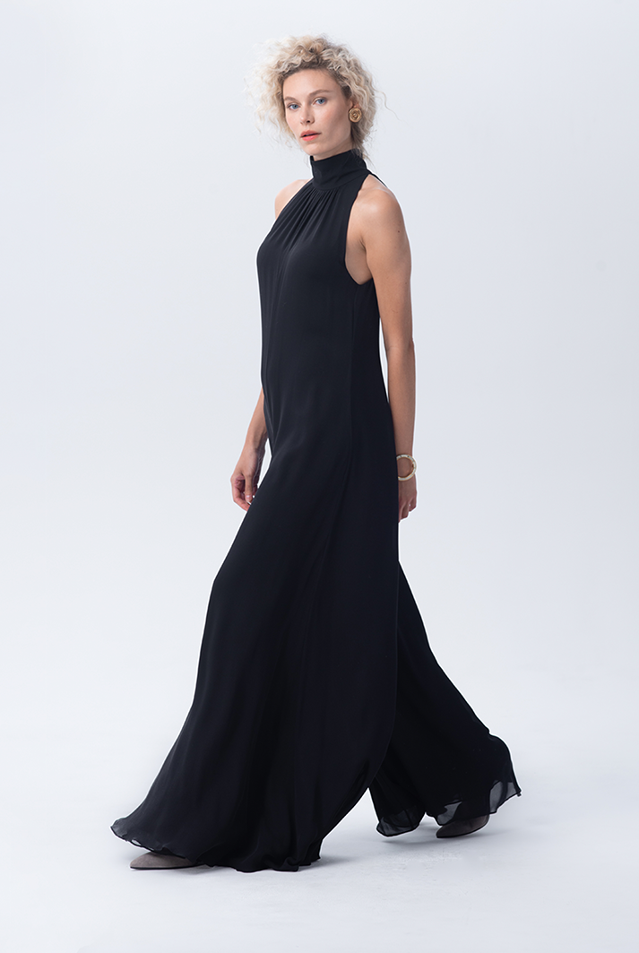 Silk jumpsuit moves beautifully to feature dramatic palazzo leg. Invisible zipper closure at back featuring keyhole opening and covered buttons at the neck. Comes with a matching removable belt.