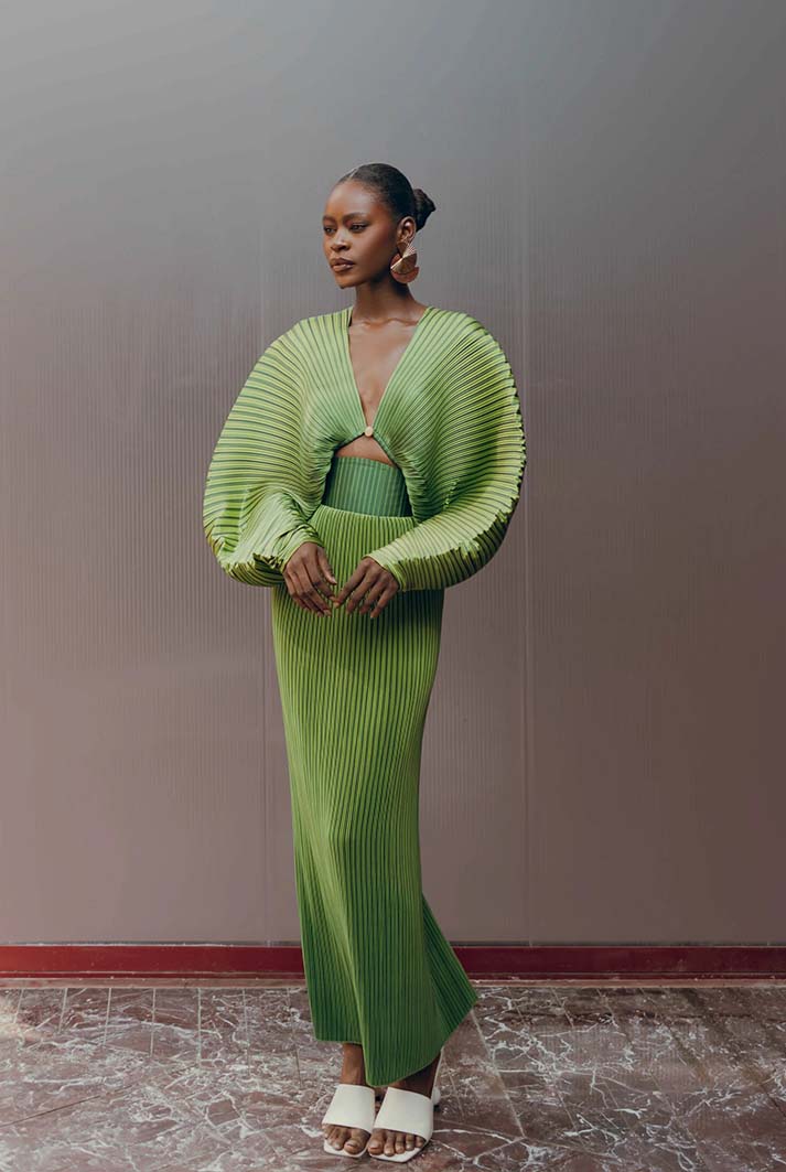 Crafted from pin stripe pleated fabric with a subtle stripe print, the textured surface adds movement and dimension to the design. A functional center front button closure allows for easy styling, while the hem finishes just below the bust for a sharp, contemporary look. Perfect for spring dressing, the BALU Top pairs effortlessly with high waist trousers or the matching Beka Maxi Skirt for a directional yet refined outfit.