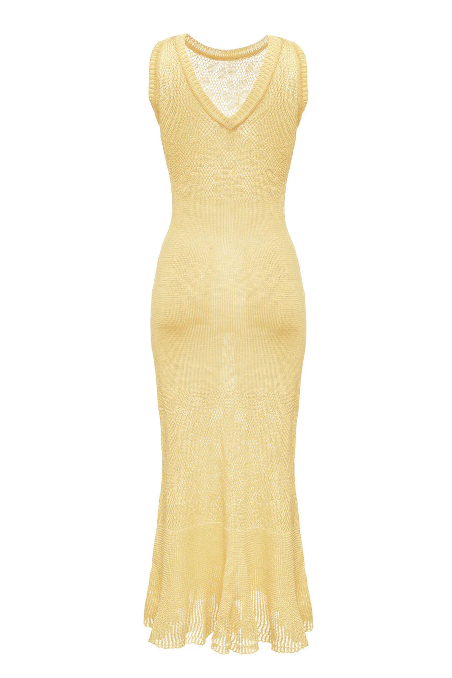 Add a touch of modern elegance with the Butter Yellow Knit Midi Dress with Feathers, a statement piece that blends playful detail with refined craftsmanship.