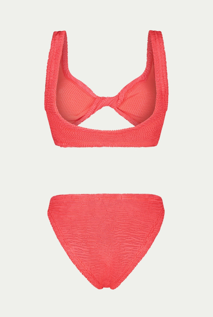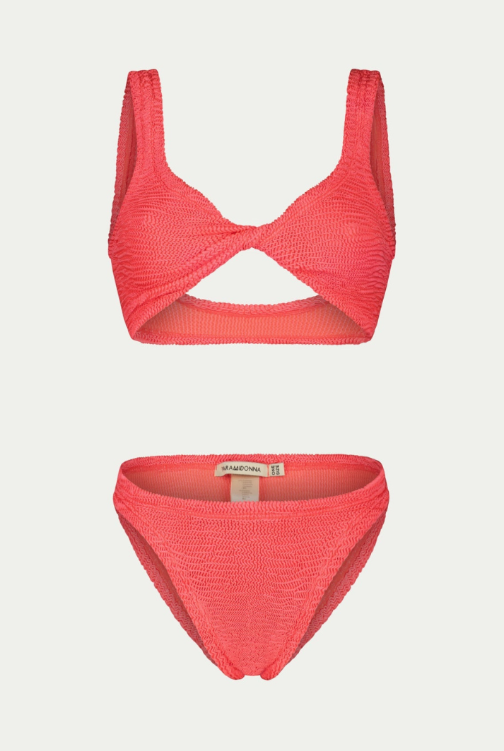 Elegantly crafted from highly stretchable, premium fabric, the DONIKA swimsuit set is designed to flatter a wide range of body types - from size XS to 2XL. The top is distinguished by a graceful twist detail that enhances the décolletage with understated sophistication, while the dual shoulder straps provide gentle support and refined structure. The bottom features a low-rise silhouette with moderate coverage, sculpting the figure with subtle allure. A harmonious fusion of comfort and elevated style, the DONIKA set is the embodiment of prominent swimwear.