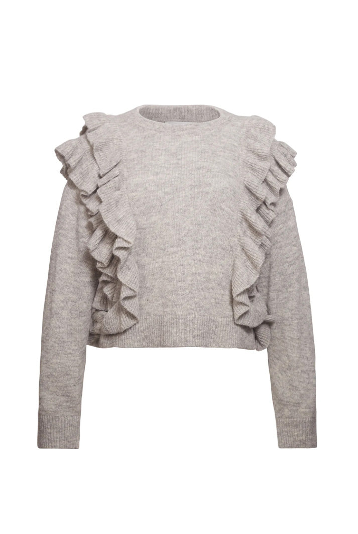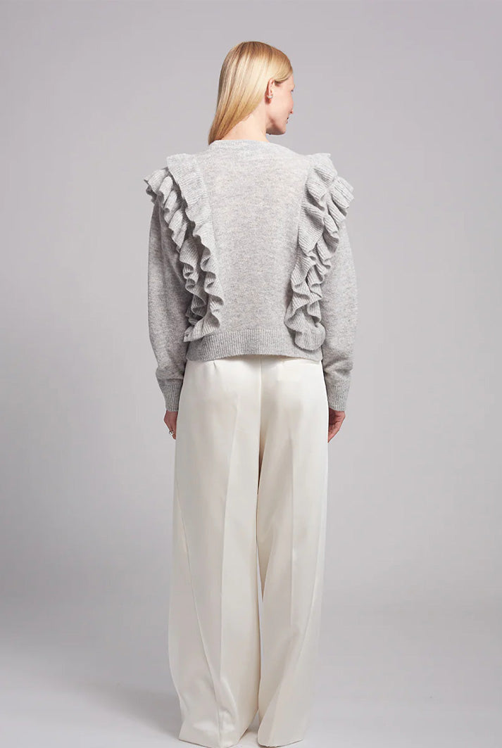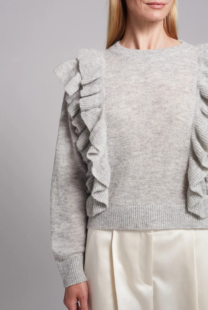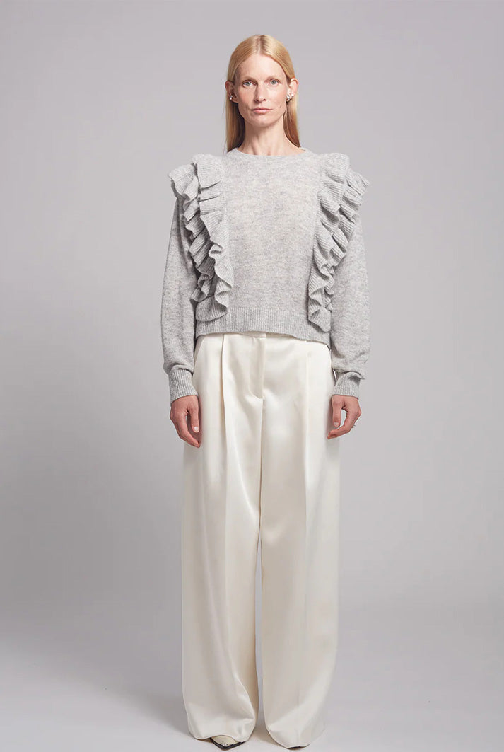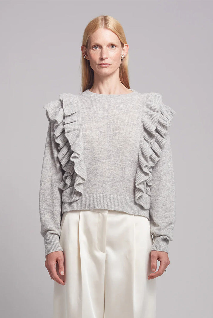Elina is an emotional, must-have relaxed sweater with feminine yet relaxed double ruffle detail placed on shoulder and side body. Knit with the softest air-spun alpaca yarn in a light weight jersey stitch. This piece can be styled in a relaxed or dressier way, whatever your mood!