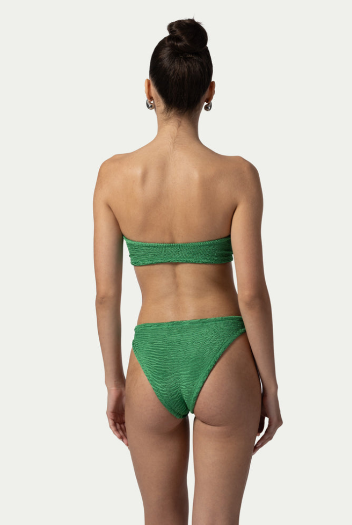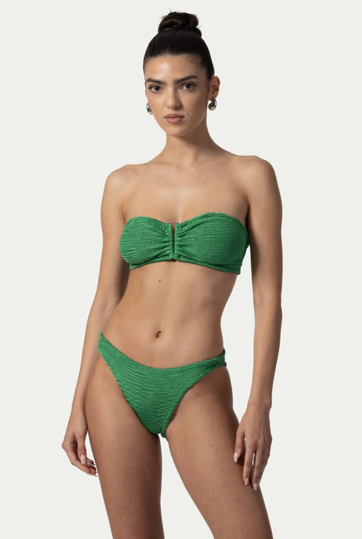 The one size model is designed to flatter sizes from XS to 2XL. The strapless bustier top features a stylish cut-out in the middle, accentuated by a metallic accessory, while the moderate cut, low-waisted bikini bottom ensures a comfortable fit. This swimsuit is perfect for achieving an even tan. FRIDA's adaptable design suits women of all bust sizes, ensuring a great fit every time.