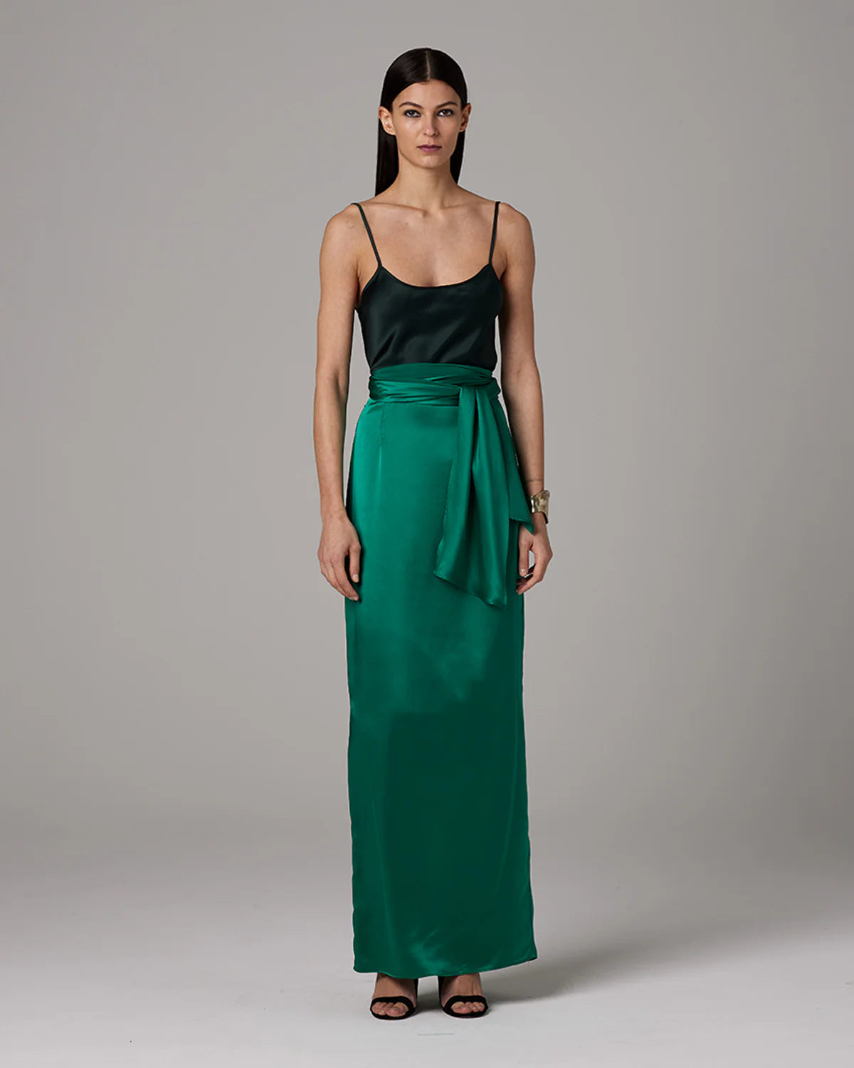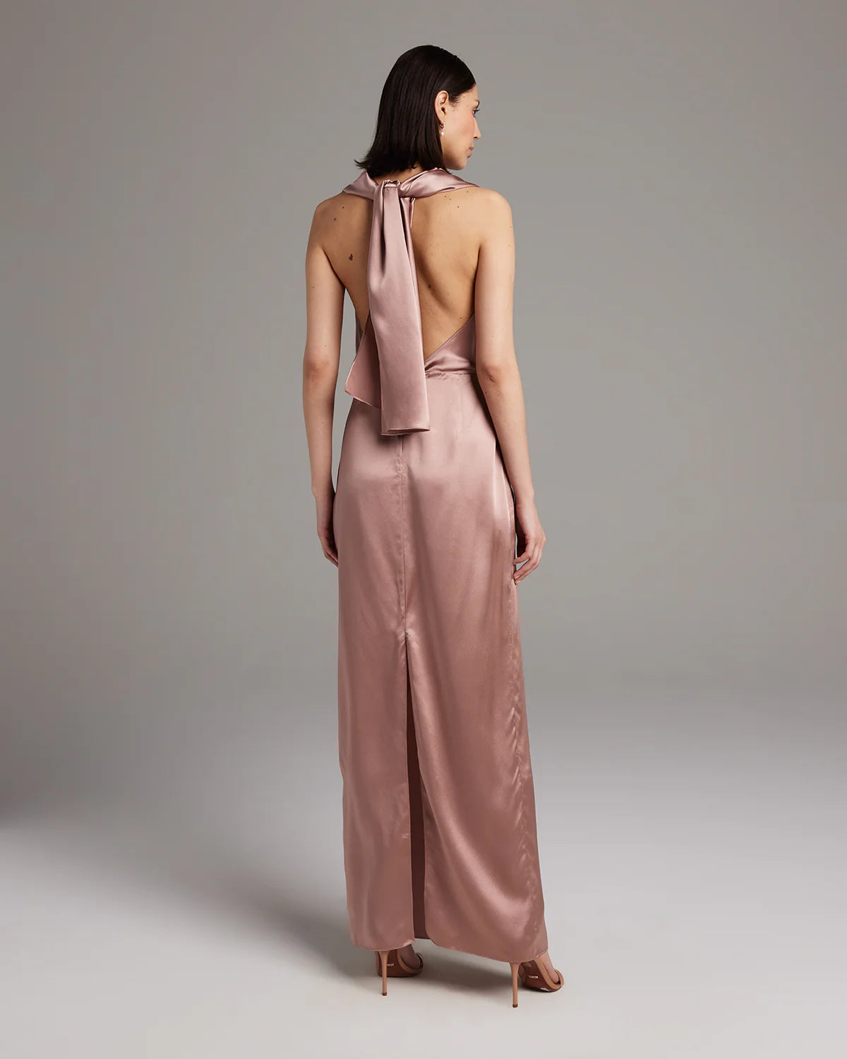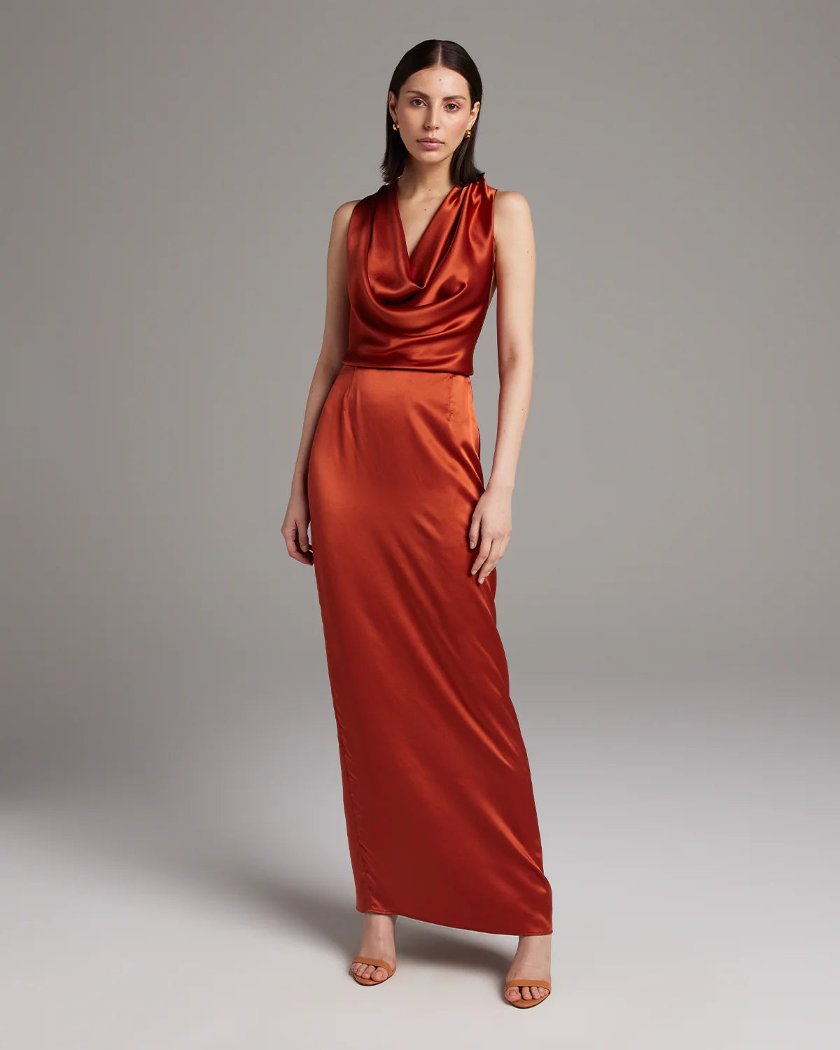 This Convertible Dress makes the perfect statement piece. It is an elegant backless halter dress, and also converts to a chic maxi skirt with a dramatic wrap sash at the waist. It features copper silk charmeuse fabric.