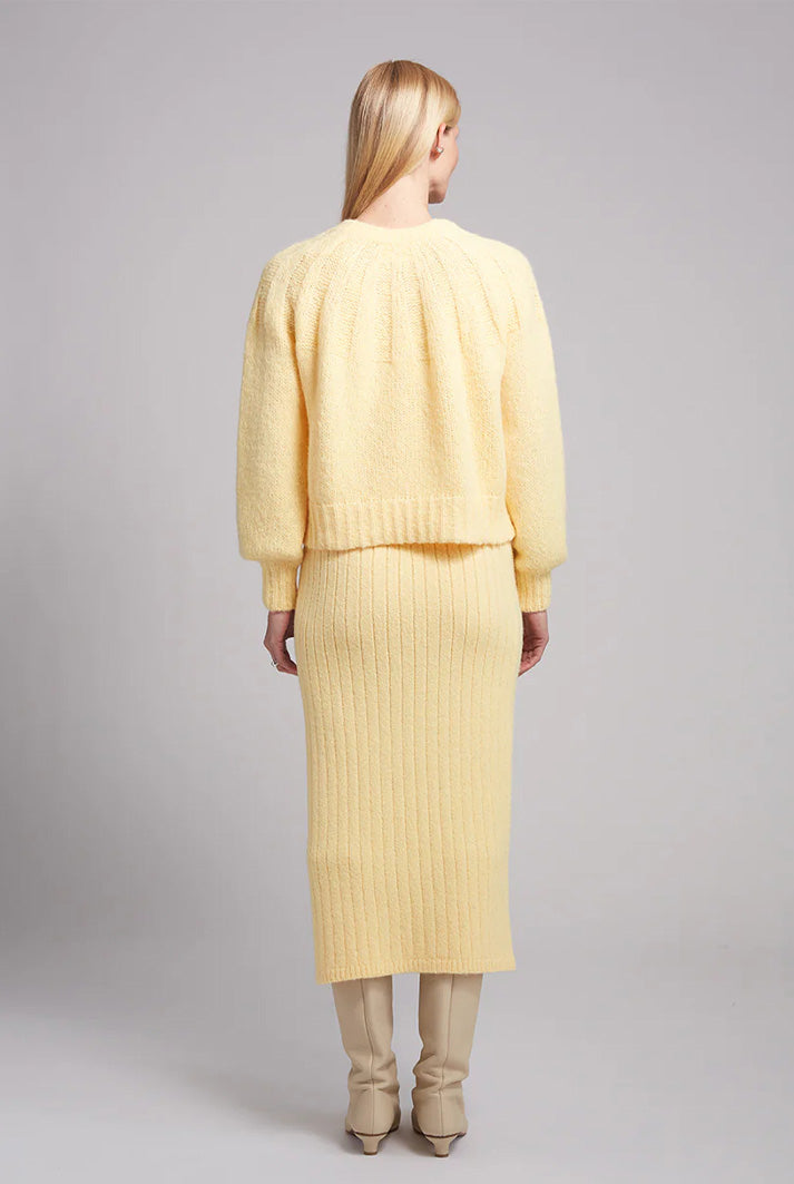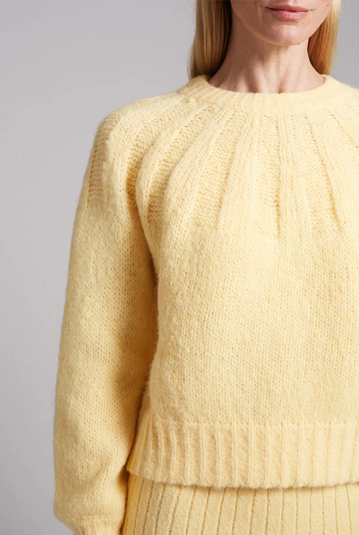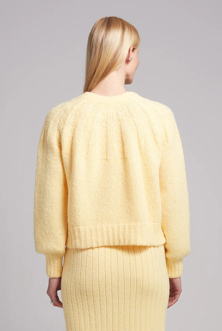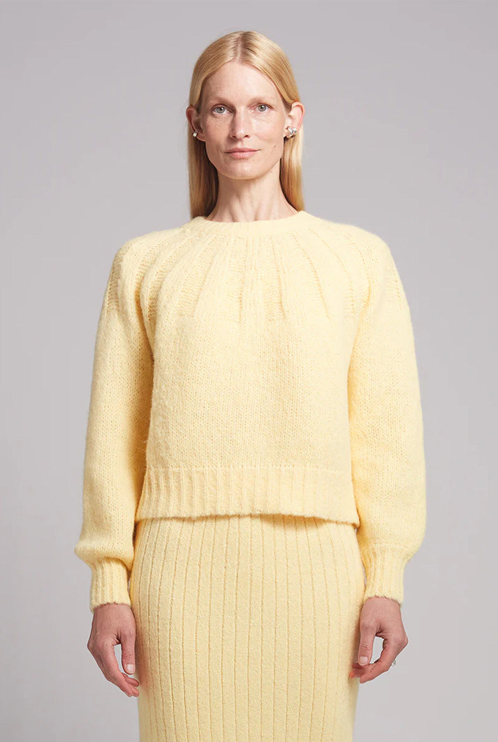 Mila is a relaxed fashion-staple sweater to pop-on-and-go with a feminine blouson-sleeve, a circular ribbed yoke and a slightly-cropped body-proportion, you can pair her back to a high-waisted pants perfectly, making you feel both refined, yet relaxed.