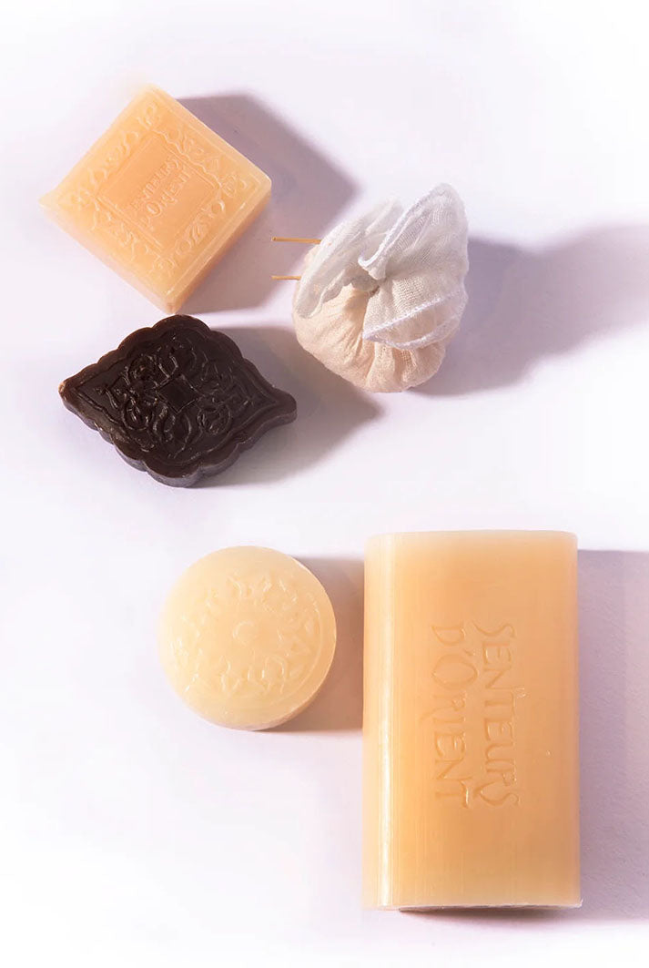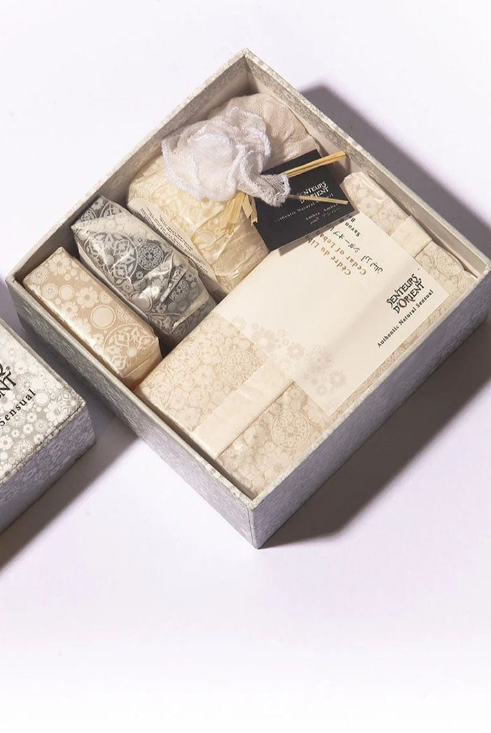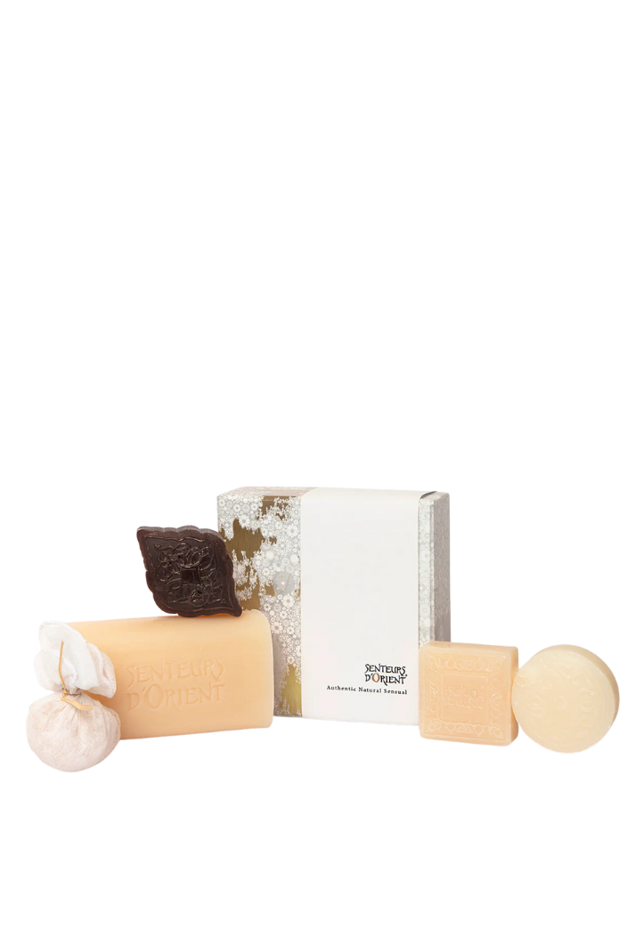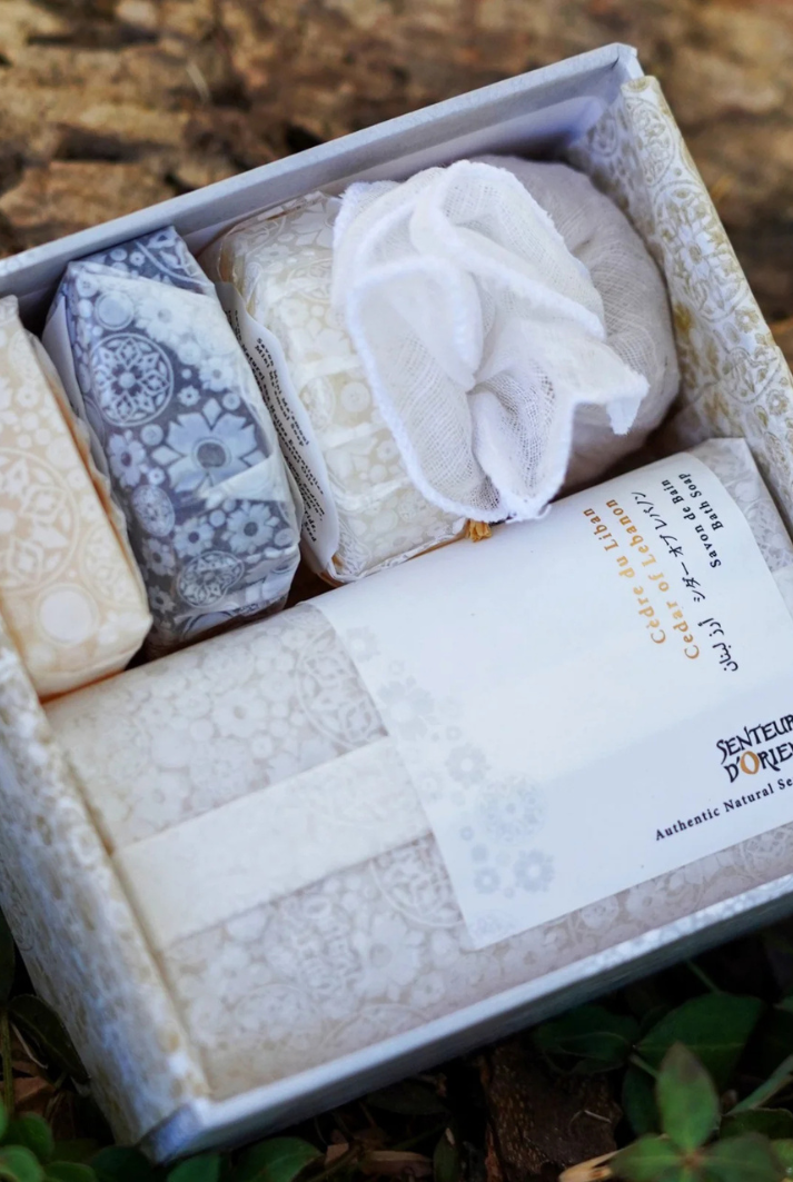 Inside, you will find a curated selection of handmade aromatherapy soaps and a scented bath salt pouch, all crafted to create a soothing, cocooning experience. Each pure vegetal soap is made with shea butter, glycerin, vegetal oils, and essential oils, then handcrafted by local artisans and air dried for ten days. The bath salt pouch is delicately infused with essential oils and prepared by hand for a deeply calming soak.