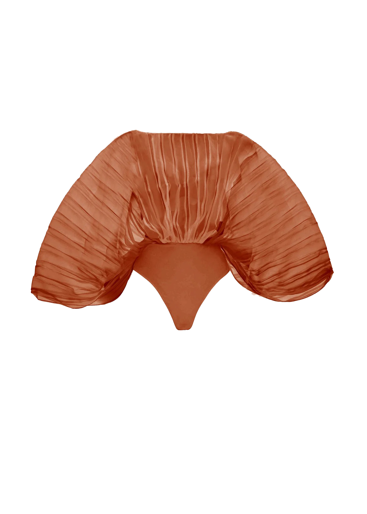 The SOMBRA leotard is a sculptural masterpiece. Playing on the delicate nature of organza and the textural appeal of pleats this style was inspired by the unique patterns and proportions of mushroom caps. The SOMBRA leotard features an inner knit leotard layer with a convenient snap closure. Confidently pair the SOMBRA leotard with our AKACIA pleated shorts.