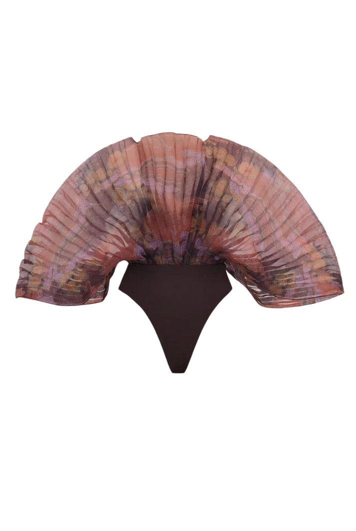 The SOMBRA bodysuit is a sculptural masterpiece and is back in our signature KAVA print. Playing on the delicate nature of organza and the textural appeal of pleats, this style was inspired by the unique patterns and proportions of mushroom caps. The SOMBRA bodysuit features an inner knit leotard layer with a convenient snap closure. Confidently pair the SOMBRA bodysuit with the LOTI DRAPE PANTS.