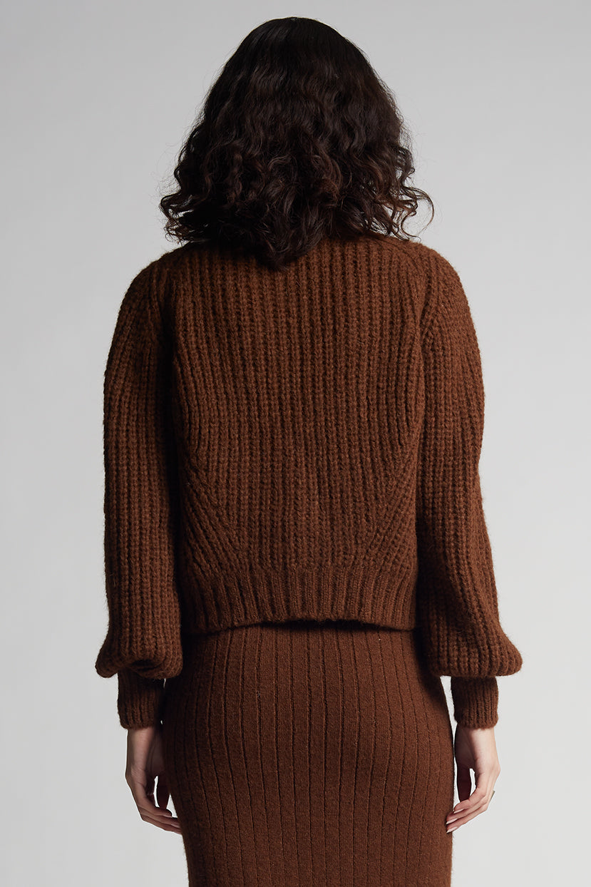 brown alpaca cropped cardigan with blouson sleeves and front buttons